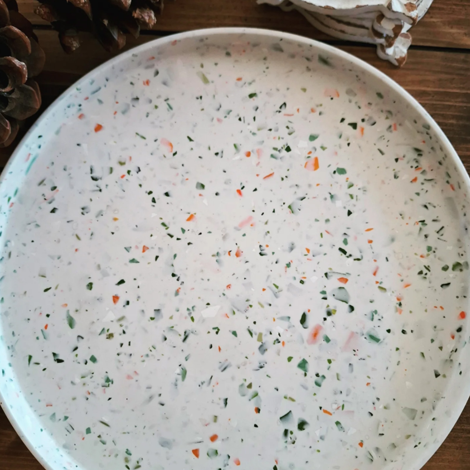 Χειροποίητος από jesmonite και διακοσμημένος με terrazzo σχέδιο, κάθε κομμάτι είναι μοναδικό και γεμάτο χαρακτήρα. Με διάμετρο 30 εκ., είναι ιδανικός για να φιλοξενήσει τα καθημερινά σου αντικείμενα, να αναδείξει κεριά και διακοσμητικά ή να προσθέσει μια δροσερή πινελιά στο τραπέζι σου.